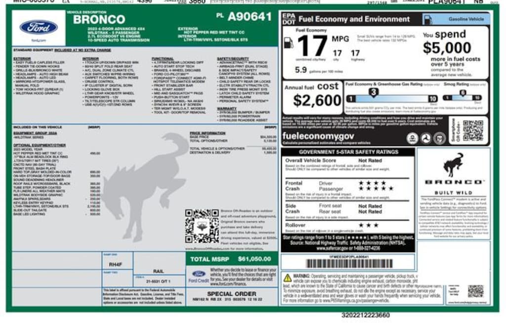 4-Wheel Disc Brakes, 7 Speakers, ABS brakes, Air Conditioning, AM/FM radio: SiriusXM with 360L, AM/FM Stereo, Auto High-beam Headlights, Black Roof Rails w/Crossbars, Brake assist, Carbonized Gray Molded-In-Color Hard Top, Compass, Delay-off headlights, Driver door bin, Driver vanity mirror, Dual front impact airbags, Dual front side impact airbags, Electronic Stability Control, Emergency communication system: 911 Assist, Exterior Parking Camera Rear, Front & Rear Floor Liners w/o Carpet Floor Mats, Front anti-roll bar, Front Bucket Seats, Front Center Armrest, Front reading lights, Front Row Top Panels & Door Storage Bags, Front Row Top Panels Storage Bag, Front wheel independent suspension, Fully automatic headlights, Hard Top Sound Deadening Headliner, Heated door mirrors, Illuminated entry, Integrated roll-over protection, Keyless Entry Keypad, Low tire pressure warning, Occupant sensing airbag, Outside temperature display, Overhead airbag, Overhead console, Panic alarm, Passenger door bin, Passenger vanity mirror, Power door mirrors, Power steering, Power windows, Radio data system, Radio: 6 Speakers w/Subwoofer Delete, Rear-Window Defroster & Washer, Remote keyless entry, Security system, SiriusXM Radio w/360L, Speed control, Split folding rear seat, Steering wheel mounted audio controls, SYNC 4, Tachometer, Telescoping steering wheel, Tilt steering wheel, Traction control, Trip computer, Variably intermittent wipers, Wheels: 17" Black High Gloss-Painted Aluminum.